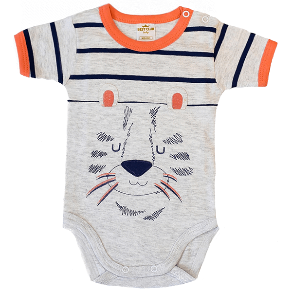 Gola com acabamento reforçado; Abertura no ombro; Bordado "Tigre" com proteção no avesso para não irritar a pele do bebê; Fecho em botões de pressão; Confeccionado em suedine penteado; Lavar com cores similares e não deixar de molho.